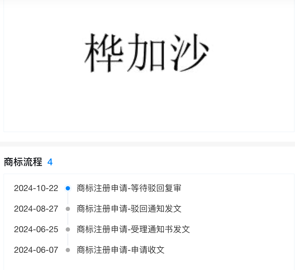 据企查查显示,“桦加沙”在2024年6月曾被申请为商标,国际分类为金融物管,不过已被驳回。